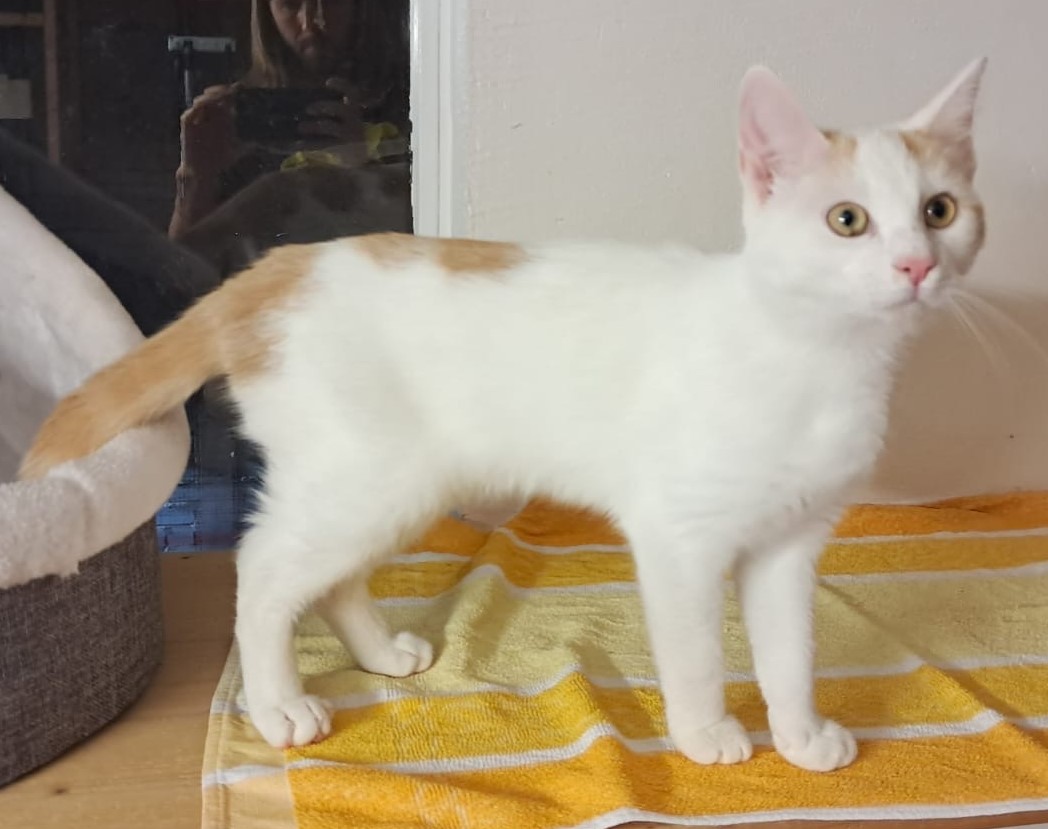 Die weiß-rote Katze namens Annabell ist im Frühjahr 2025 geboren. Sie ist sehr neugierig und nutzt jede Gelegenheit zum Kuscheln und Spielen direkt aus.