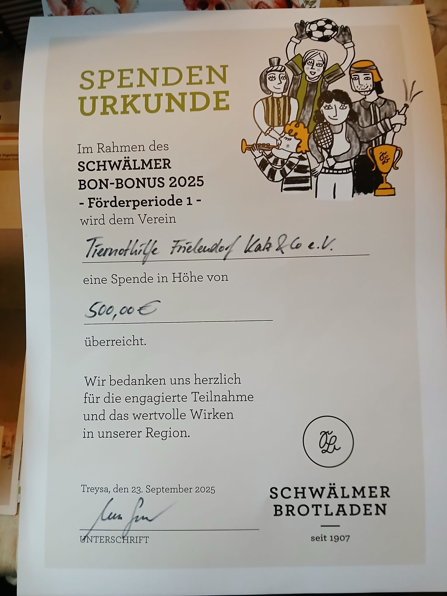 Ein riesengroßer Dank geht natürlich an unsere Unterstützer von Katz & Co. e. V., die durch ihre Einkäufe in den Schwälmer Brotläden und das Sammeln ihrer Bons diesen mega Erfolg überhaupt erst möglich gemacht haben. Ihr seid großartig!